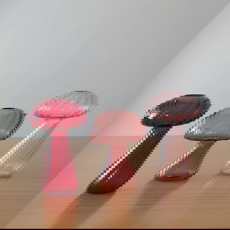 El florero de vidrio en forma de hongo es una pieza única que combina funcionalidad y estilo.